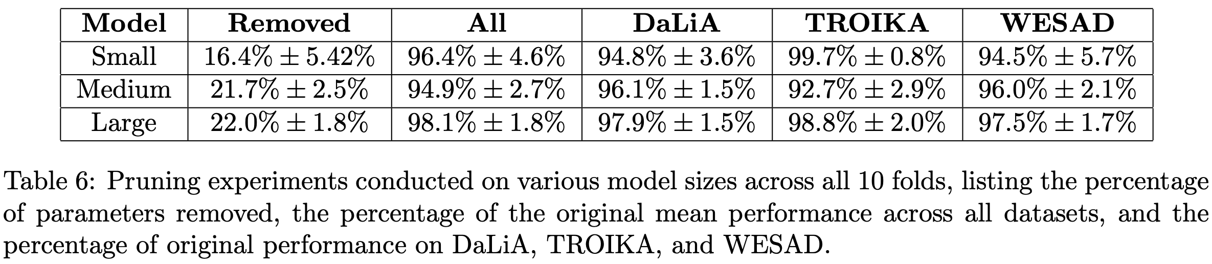 模型的可扩展性表现同样令人满意:中等模型以仅0.4%的参数规模,在所有数据集上达到Segade模型98%以上的性能;最小模型以0.06%的参数量,在DaLiA和WESAD数据集上保持94%的性能水平,在TROIKA数据集上仍能达到86%的基准性能。详细性能对比参见表1。