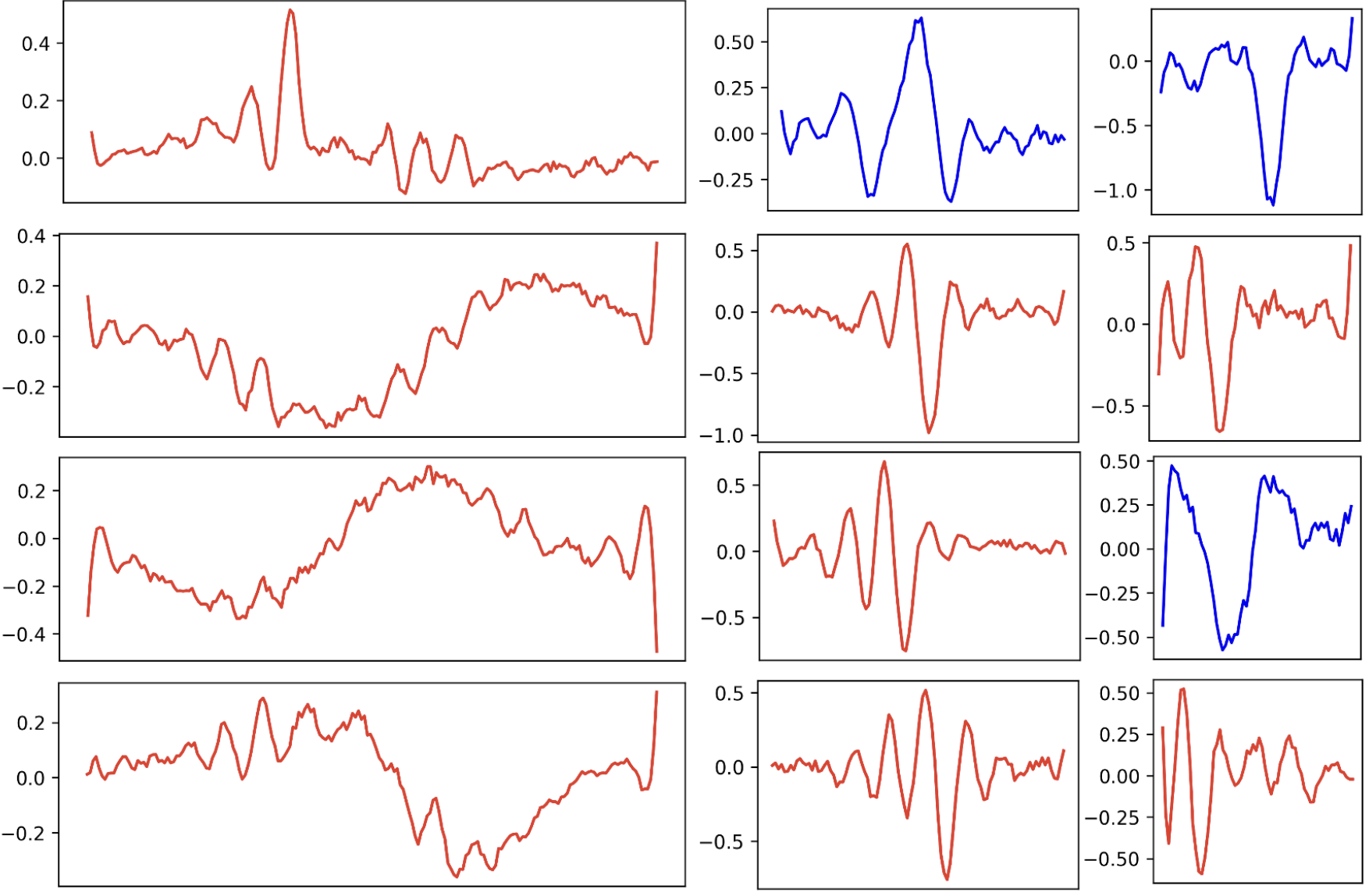 Figure 8:All 12 kernels of the small model. Blue kernels contribute primarily to the detection of “clean” signals and red kernels contribute primarily to the detection of artifacts.