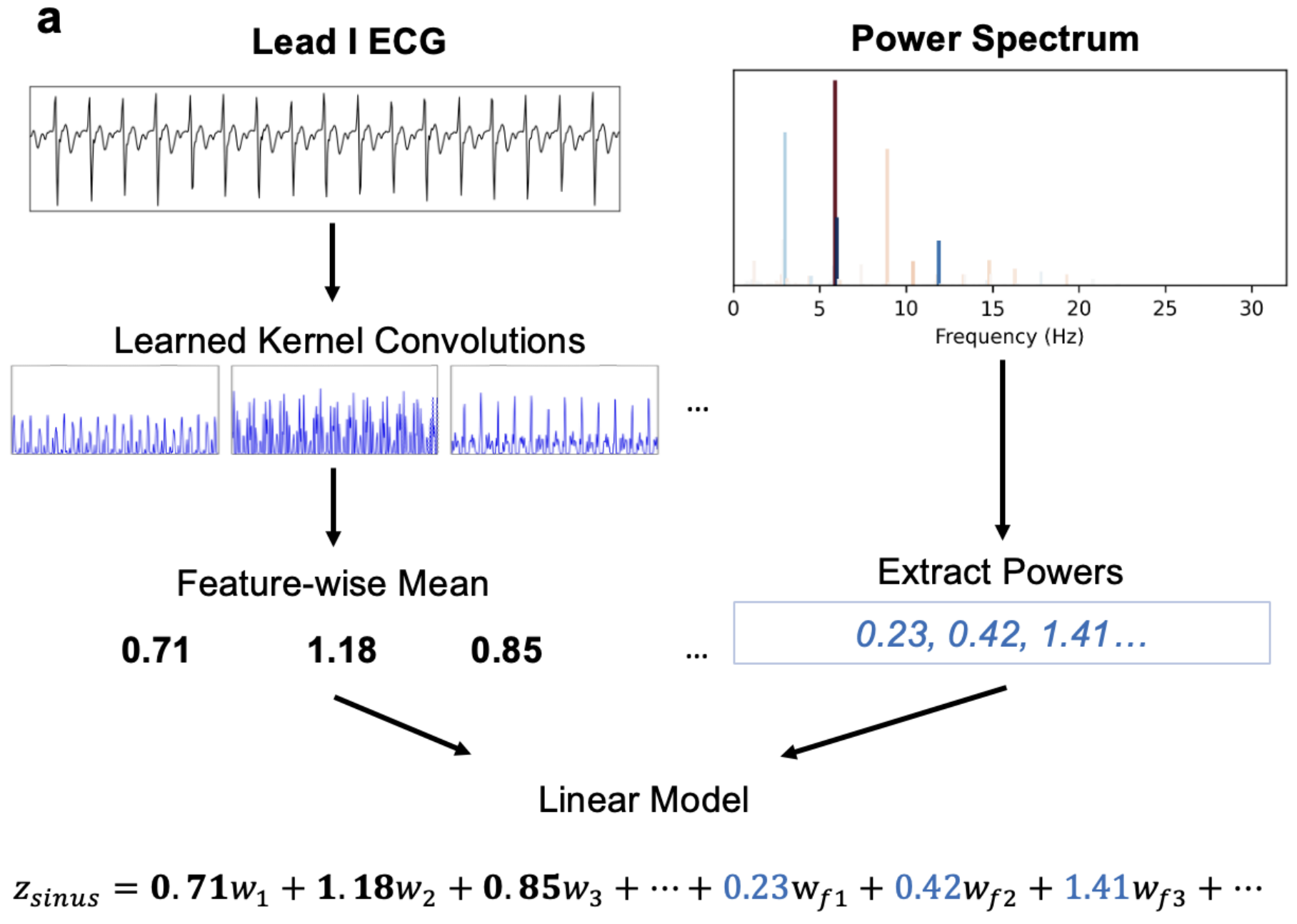 图2:ECG处理流程。a.处理单导联 ECG 的流程。首先,将一组学习到的卷积核应用于 ECG 信号,生成若干特征图。接着,计算每个特征图的均值,这些均值被用作线性模型的输入。从功率谱中获得的全局频率信息也作为线性模型的输入,以产生一个逻辑值。