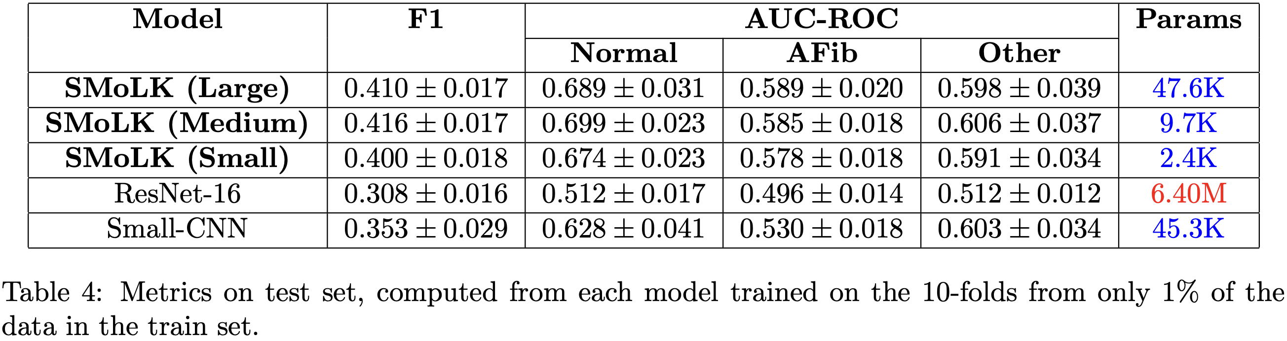 在单导联ECG房颤检测任务中,SMoLK在性能指标上与深度ResNet相当,但参数量不足后者的1%,且在低数据场景下表现尤为出色。