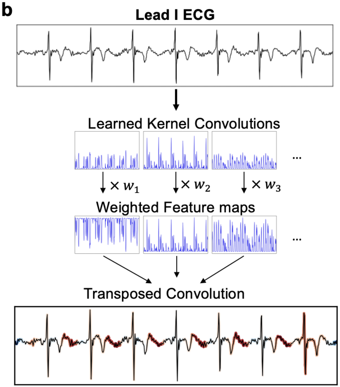 图2:ECG处理流程。b.用于解释子图a中从学习核模型得到的预测的反向流程。首先,以与a相同的方式,通过学习的卷积核生成特征图。然而,这里并非计算特征图的均值,而是将特征图与其对应的类别权重进行逐元素相乘。功率谱不用于解释过程。最后,应用转置卷积来计算输入信号每个部分的重要性。该方法几乎是前向过程的精确逆过程,允许以原则性的方式将重要性分配给与输出类别逻辑值直接相关的输入信号。值得注意的是,该方法正确地将延长的 PR 间期标记为将此 ECG 分类为一度心脏传导阻滞的最重点特征,表明本文的模型学习到了重要特征而非伪相关。