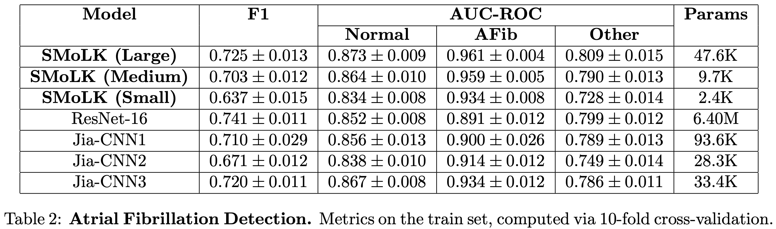 在独立保留测试集上,所有 SMoLK 模型在正常心律和房颤检测上的 AUC-ROC 均优于其他基线模型(见表3)。然而,在检测未知的"其他"心律方面,其性能逊于本文测试的两个参数量最高的模型:16层 ResNet(称为ResNet-16)和一个先前最优的卷积神经网络(称为Jia-CNN1)。
