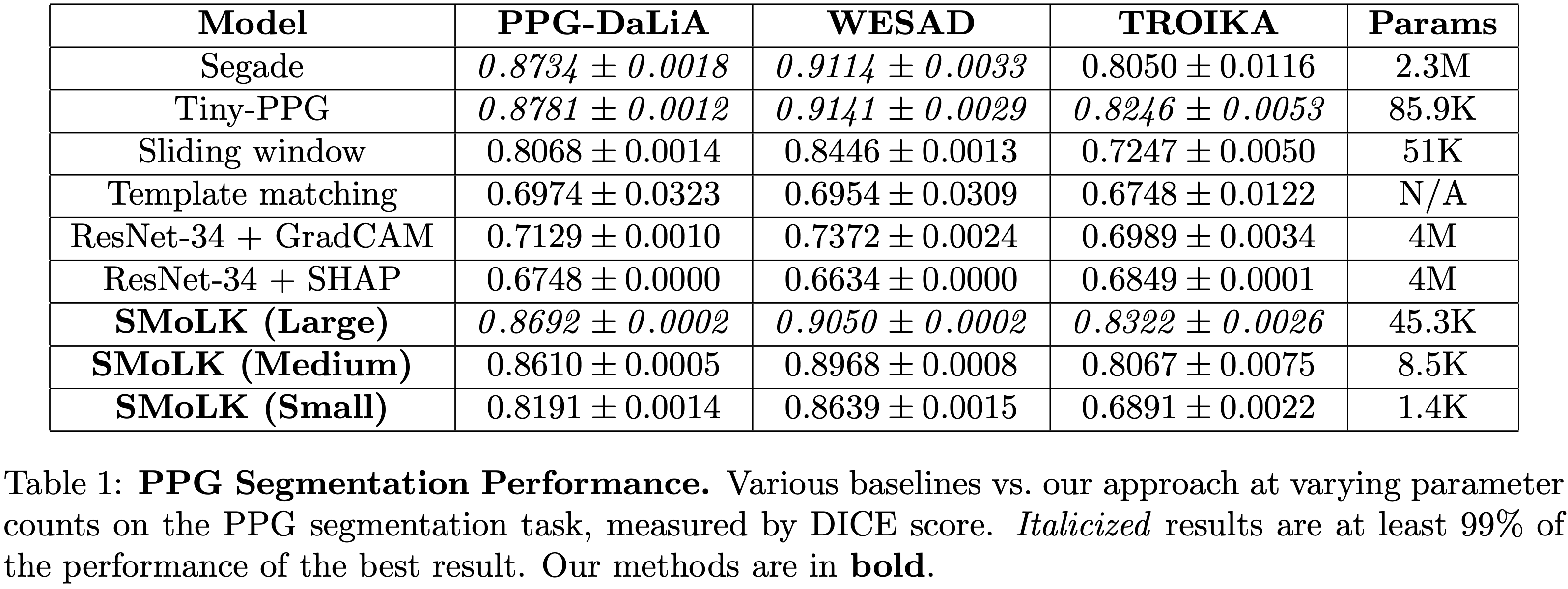 通过在DaLiA、WESAD和TROIKA三个数据集上的系统测试,本研究提出的方法在PPG信号分割任务中展现出卓越性能。与当前最优的Segade和Tiny-PPG模型相比,本文的最大模型在DaLiA和WESAD数据集上实现了超过99%的相对DICE系数,而参数数量分别仅为Segade的不到2%和Tiny-PPG的一半。即使在最具挑战性的TROIKA数据集上,该模型也显著优于其他基线方法。