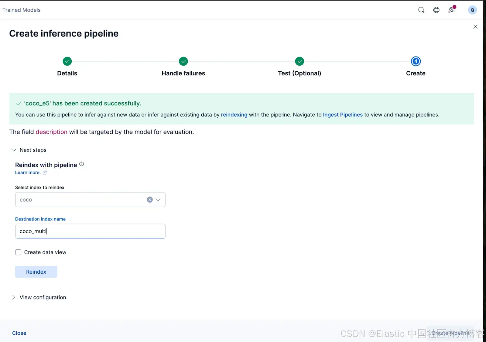 管道创建成功后,你可以立即使用该管道,通过向导将原始索引数据重新索引到新索引,从而生成嵌入。点击 Reindex 开始该过程。