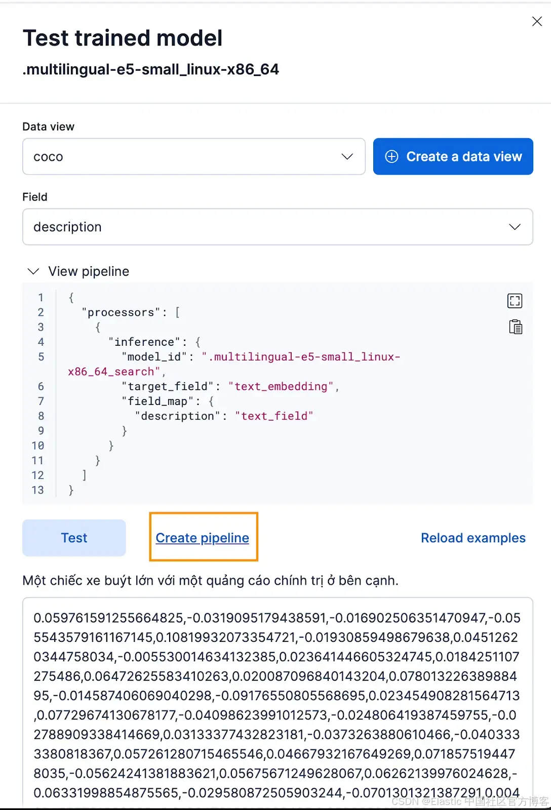 效果很好!现在我们可以继续创建 ingest pipeline 并重新索引原始文档,将它们通过管道处理,并创建一个包含嵌入的新索引。你可以点击 Create pipeline 来完成,这会引导你完成管道创建过程,并自动填充生成嵌入所需的处理器。