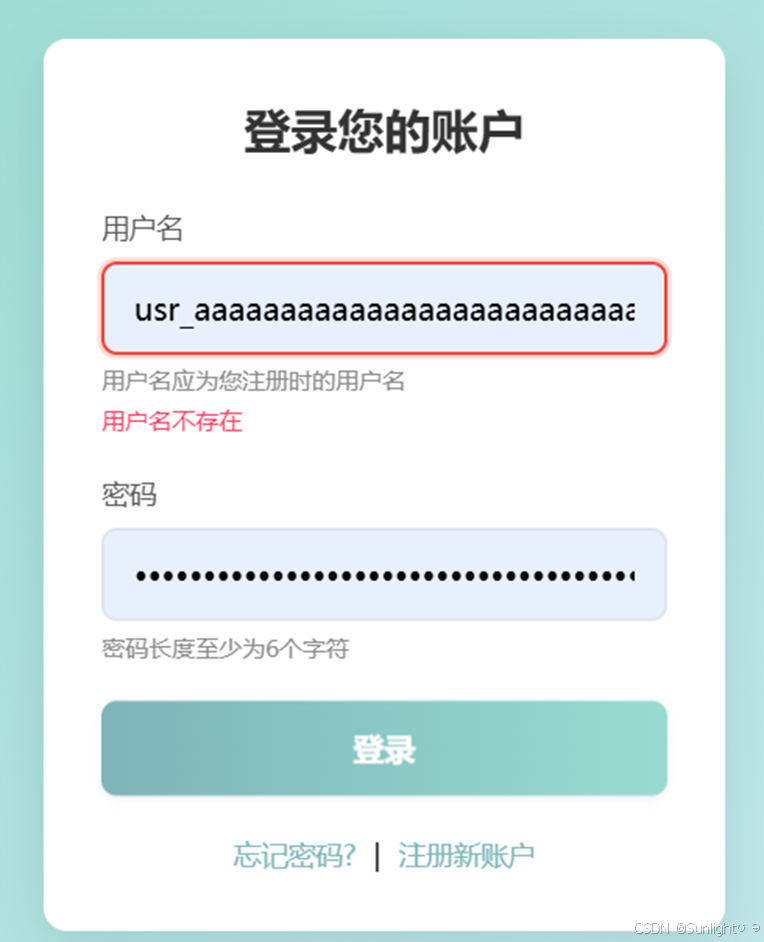 | BOUND-002 | 超长用户名/密码 | 1.输入超长用户名和密码 | 系统正确处理,不崩溃 | 不符合预期 | 展示“用户名不存在”,无法正常登录 |