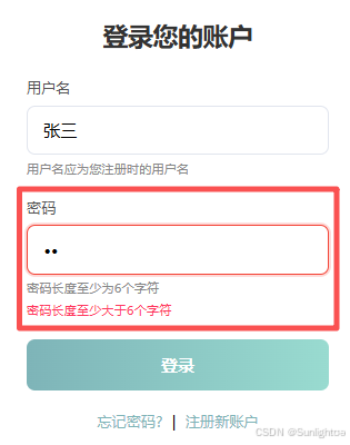 | Password-001 | 密码验证测试 | 密码长度小于6字符 | 1.输入正确用户名 2.输入长度小于6的密码 3.点击登录按钮 | 提示“密码长度至少为6个字符” | 显示“密码长度至少大于6个字符” | 不符合预期 | |