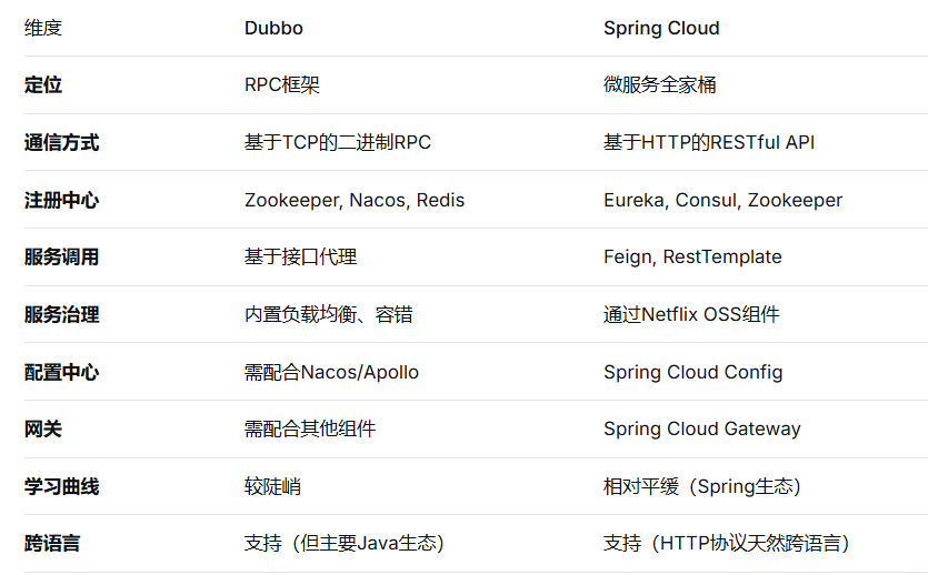 核心区别:Dubbo是RPC框架,专注服务调用;Spring Cloud是微服务全家桶。