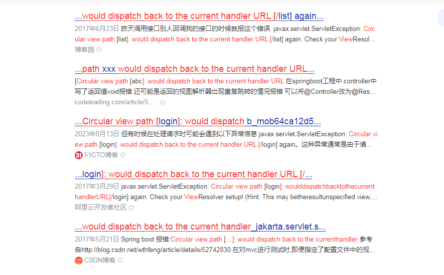 2025-11-21 22:23:49.561 ERROR 11996 --- [nio-8088-exec-7] o.a.c.c.C.[.[.[.[dispatcherServlet] : Servlet.service() for servlet [dispatcherServlet] in context with path [/bdsse] threw exception [Circular view path [test]: would dispatch back to the current handler URL [/bdsse/test] again. Check your ViewResolver setup! (Hint: This may be the result of an unspecified view, due to default view name generation.)] with root cause