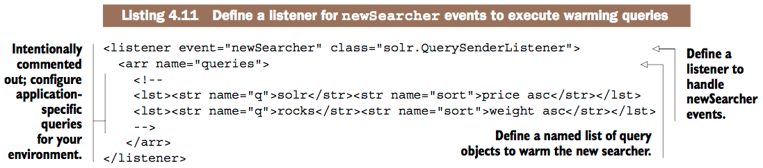 通过配置一个listener,当newSeacher事件发生时。会运行queries里面的查询用来预热缓存。配置成预热的query一般都是应用最频繁的查询,配置queries不能过多,过多会造成预热的时间太久。耗费太多server的资源。
