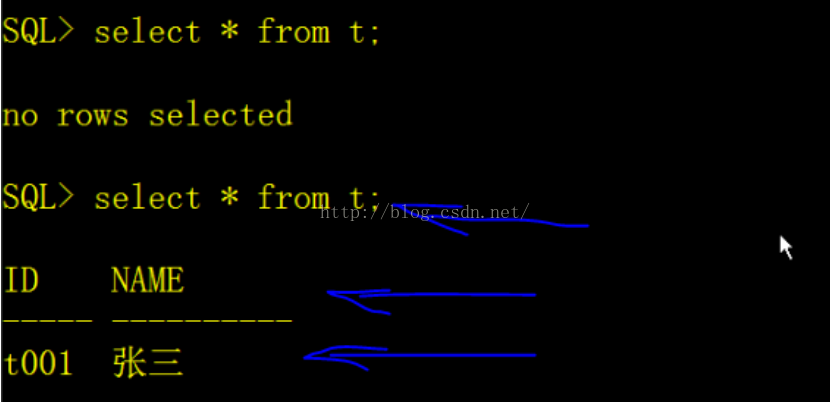 如今又一次开一个cmd窗体,用新用户lisi登录。查询t表,发现其内没有刚才加入的数据,例如以下图:
