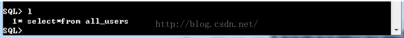 比如,假设先输入select*fromall_users;后回车。会看到全部用户,然后这条命令被存入SQL*PLUS缓存,假设这时候输入l,会出现上一条命令信息,例如以下图: