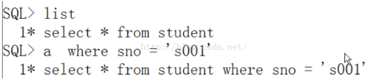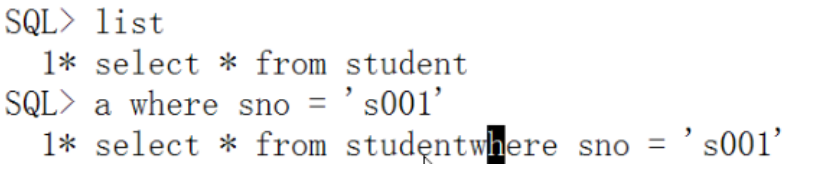 发现两个命令靠一起了,即student和where连一起了。所以在使用a命令往缓存区加入命令时候敲两个回车,当中第一个回车是a命令必须带的回车,第二个回车是作为新代码的开头被加入到缓存区,例如以下图: