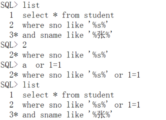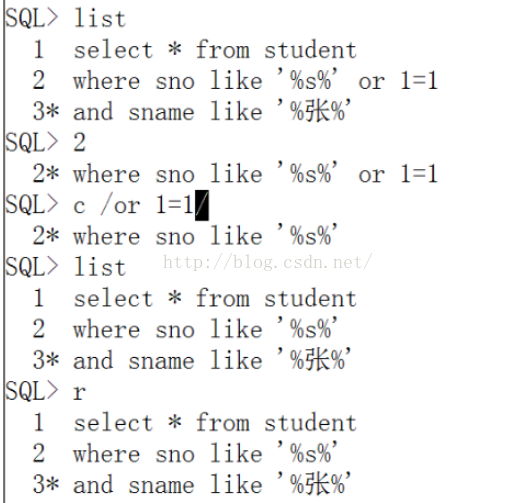 先list出缓存区全部命令,然后用n命令定位到第2行,然后用c命令将’%s%’之后命令删除,仅仅要c /or 1=1/就可以,也就是将须要删除的部分替换为空白。注意c后面两个回车。