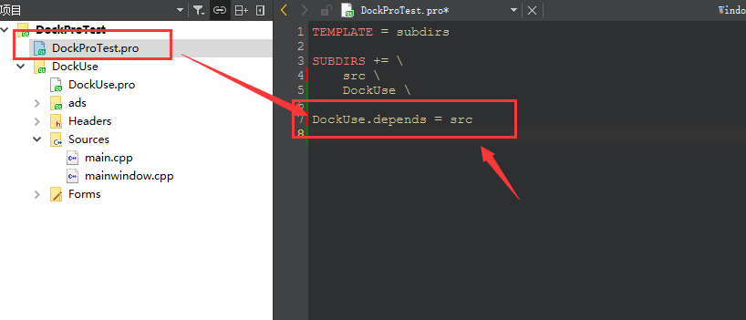 6. 在需要使用Qt-Advanced-Docking-System的项目(此处我是在DockUse.pro中添加的)Pro文件中添加如下代码
