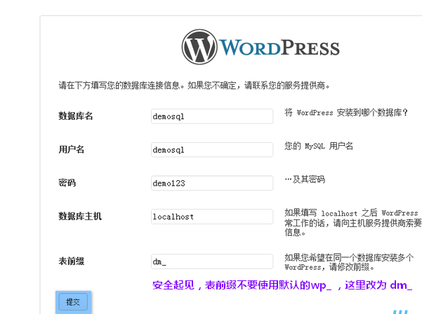 - 输入刚刚创建的数据库信息,依次填入后点提交