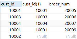 输出了10002行,相当于前面伪代码中customers表为外循环,只是将custonmers中没匹配上的10002也输出了