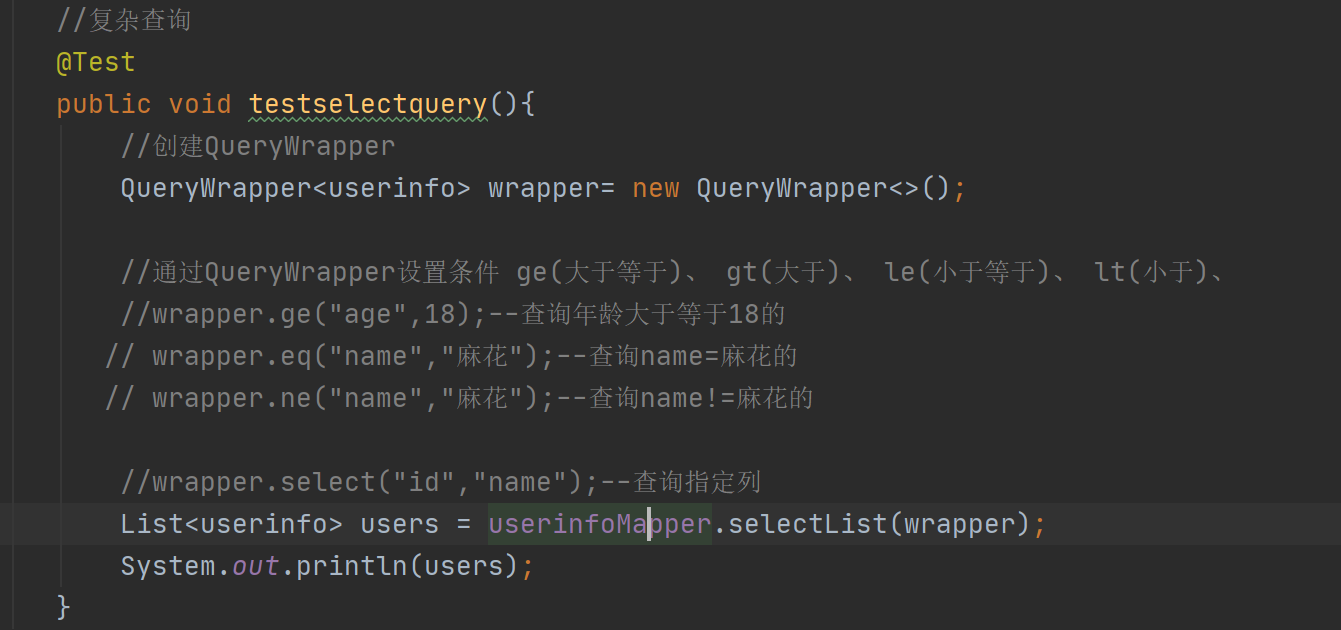通过QueryWrapper设置条件 ge(大于等于>=)、 gt(大于>)、 le(小于等于<=)、 lt(小于<)、eq(等于=)、ne(不等于!=)、like(模糊查询)、orderByDesc/Asc(排序查询)、last(语句最后拼接sql)、between(范围查询)、select(查询指定列)