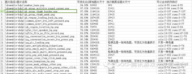 2,扫描完数据后,为了便于观察结果,会将每一张图片的可优化区域通过一个excel表的形式进行输出,包含:图片原始大小,图片可裁剪行列的起止位置。图片可优化面积,可裁剪的比例等信息。