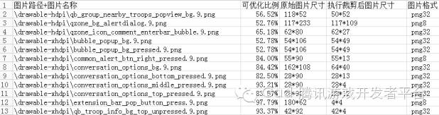 目前该小工具已经接入手Q中的自动化工具,可以针对手Q中的图片资源进行扫描,发现可以优化的图片时,会自动提单给相应的开发。由于这种方式的修改图片粒度比较低,所以,在应用到手Q中时,我们针对处理进行了一次过滤:设定扫描图片面积阈值为50*50像素点,单行可优化像素点最低为50,优化比例为大于45%。剔除比较小的优化点。