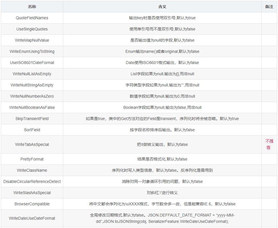 其他SerializerFeature属性作用见下表