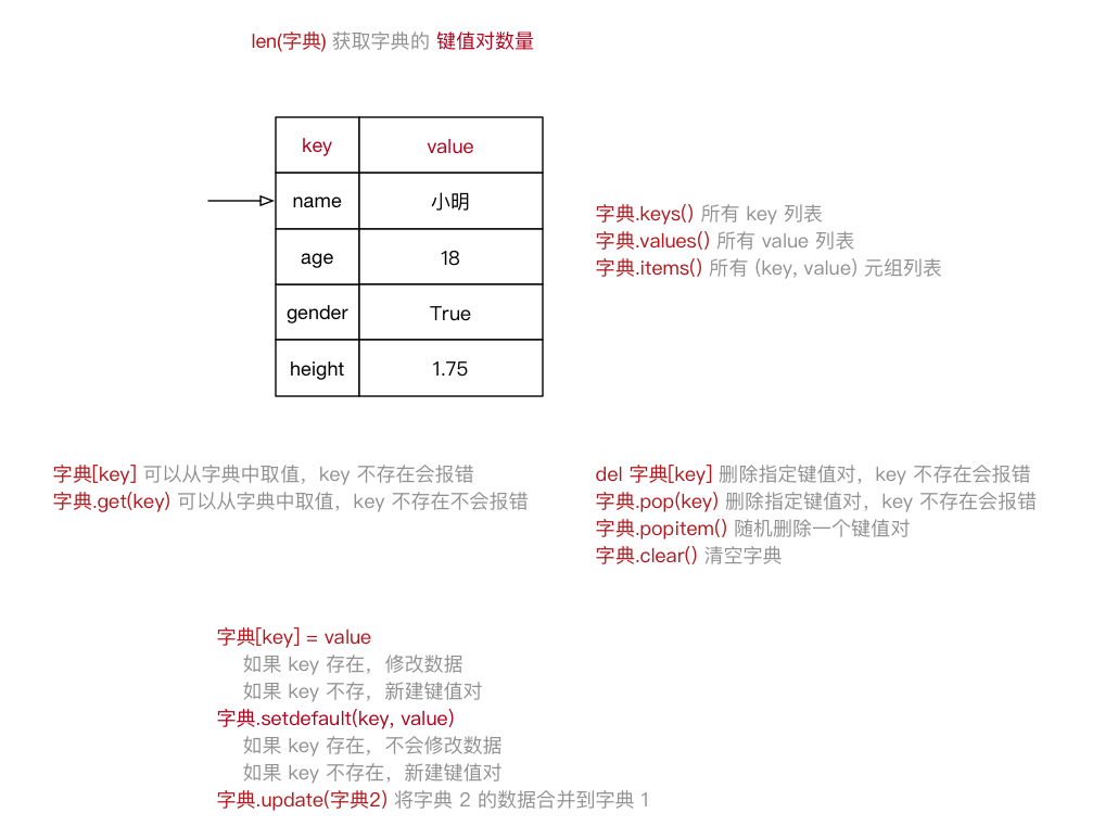 有关 字典 的 常用操作 可以参照上图练习