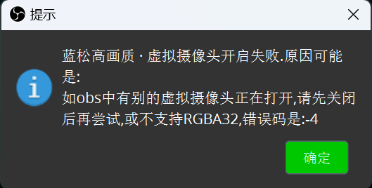 - 如果弹出如下提示,表示有开启过其它虚拟摄像头,可先关闭其它的虚拟摄像头(比如关闭OBS自带虚拟摄像头),然后从新点击打开高画质虚拟摄像头.