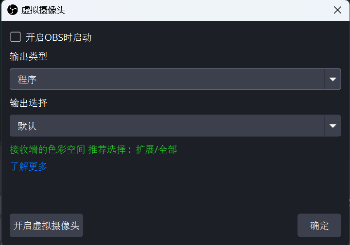 - 输出类型和输出选择一般默认即可(默认的设置就是当前OBS软件显示什么内容,就摄像头输出什么内容);如果要输出指定场景画面,或是指定源的画面,可以设置输出类型是场景或是源即可.