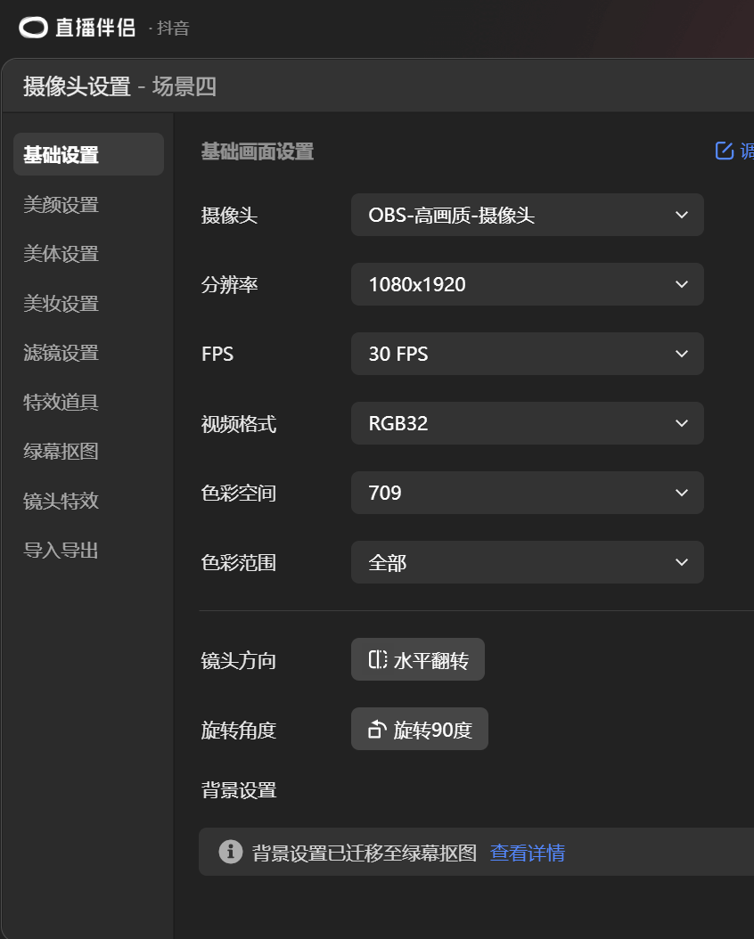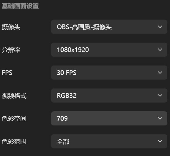 - 去直播软件里添加高画质虚拟摄像头(OBS-高画质-摄像头),下图是直播伴侣添加的设置界面(视频格式一般选择RGB32或XRGB,色彩范围选择全部)