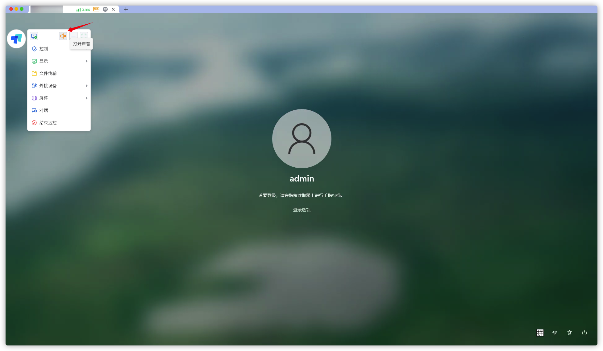 电脑端远程,我们可以打开菜单栏,即可看到声音按钮。显示x时,声音关闭,点击开启。