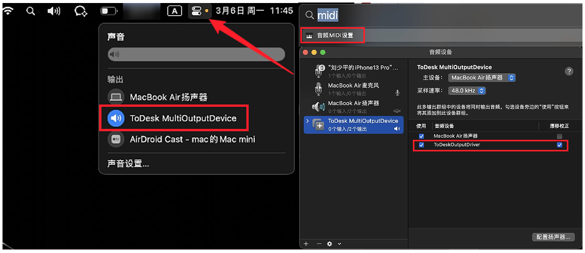 如果仍无法听到声音,可以确认下音频MIDI设置,command+空格,输入MIDI即可找到该app,查看ToDesk驱动的ToDeskOutputDriver是勾选上的即可。
