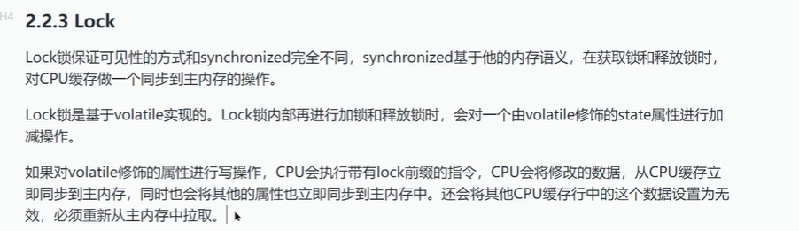 Lock锁也能实现内存可见性,因为里面的state加了volatile关键字,对类中的其它属性也会失效缓存使用主存中的内容。ReetrantLock。