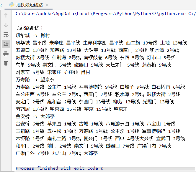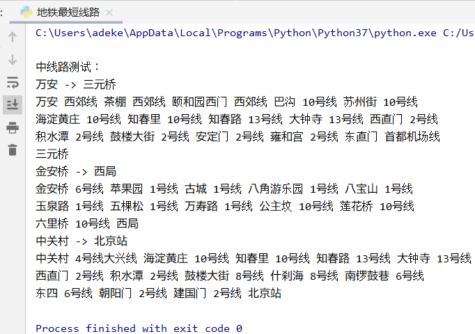 以北京地铁线路图为样例,包含交叉线路以及环线。要求指定两站之间最短(最少经过站数)乘车路线;输出指定地铁线路的所有站点,通过最短路径算法计算地铁线路两站间最短距离,获取最佳线路方案。