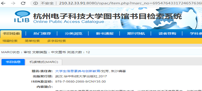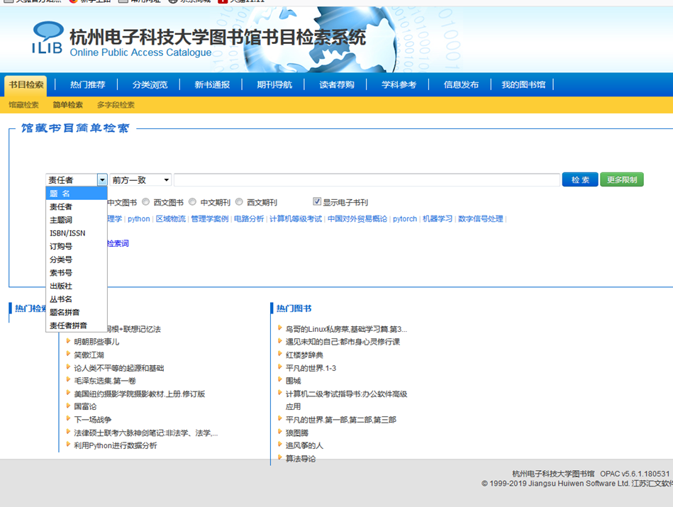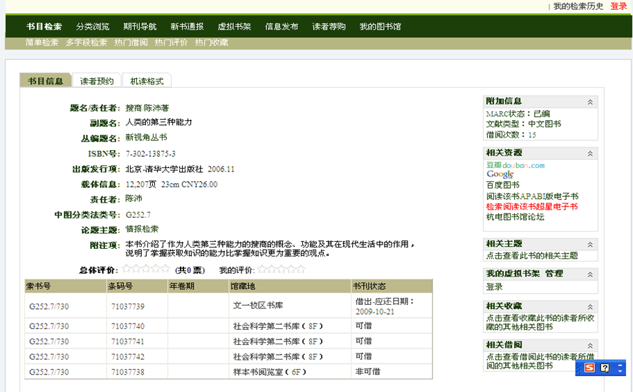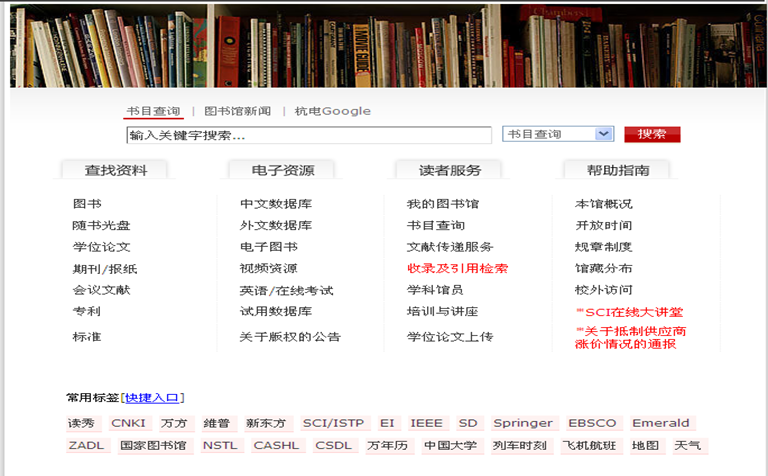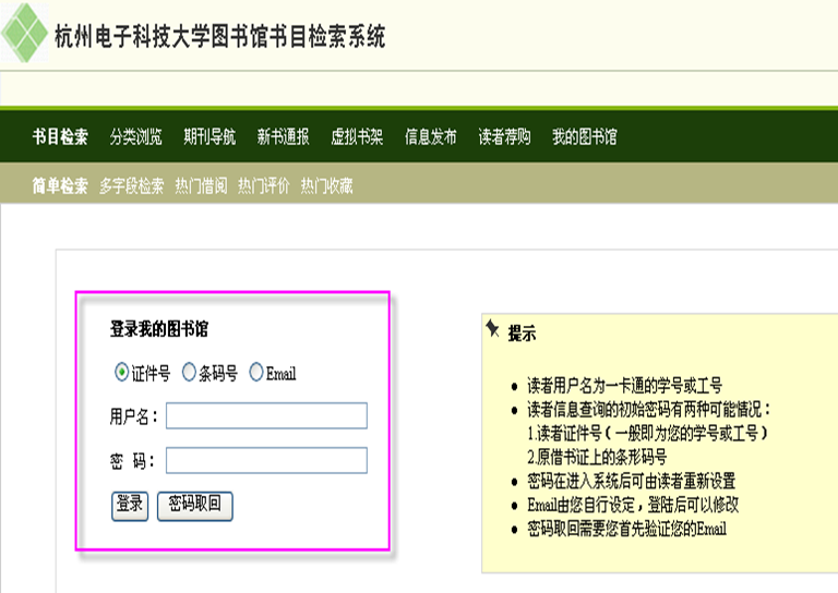 - 功能:书目检索、分类浏览、期刊导航、新书通报、购书推荐、信息发布、读者推荐、个人图书馆(读者信息管理)。