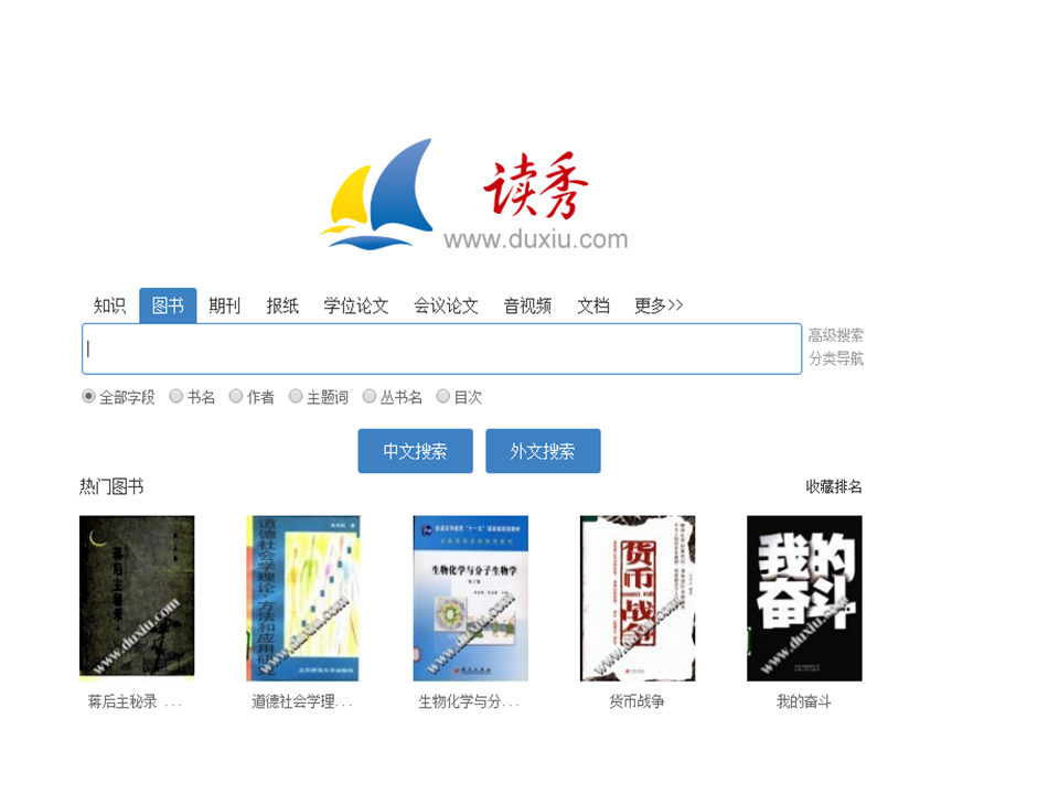 - 读秀学术搜索是一个跨库学术搜索引擎,是全球最大的中文电子图书搜索与文献传递系统。
