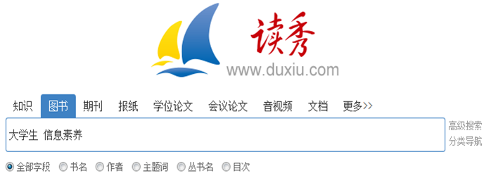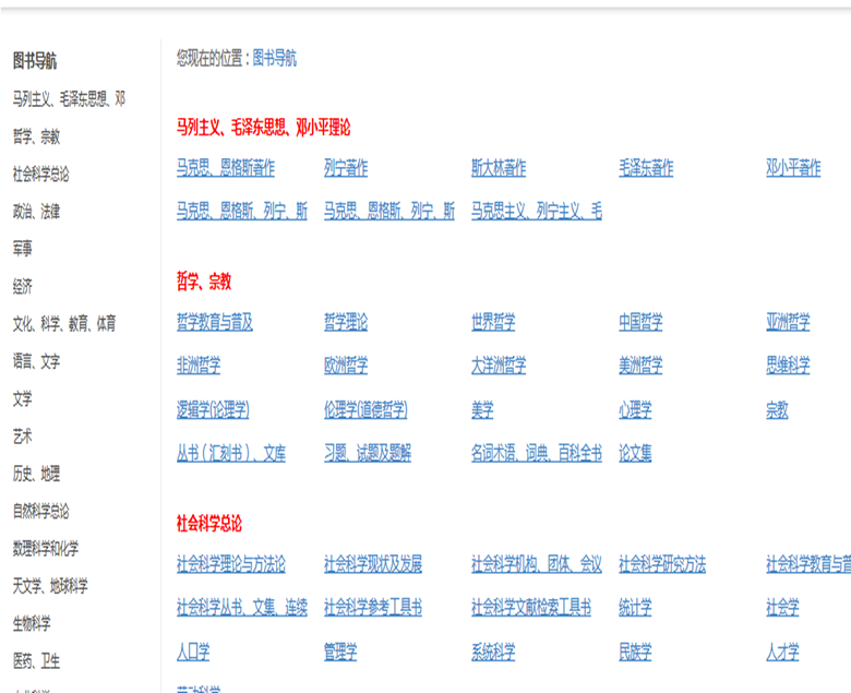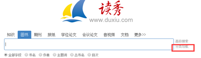 读秀主页选择“图书”检索框右侧点击分类导航,点击某一学科,逐级点开浏览