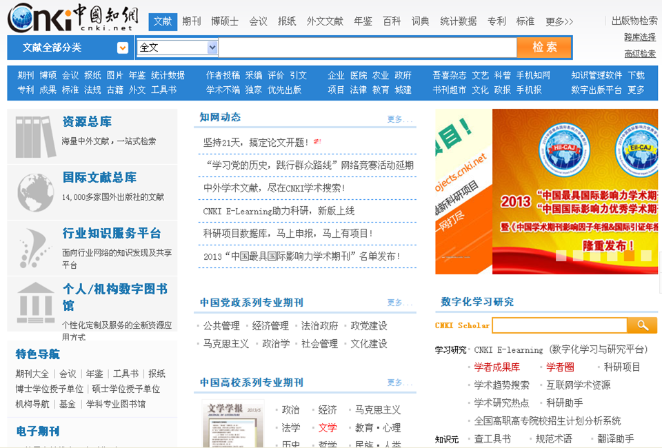 - 知识来源:目前收录中国国内8000种学术期刊,全文总量5400万篇,独家授权期刊1400种,网络首发1100种。