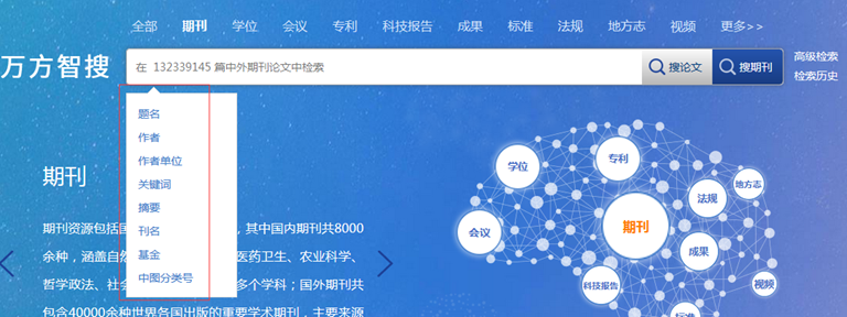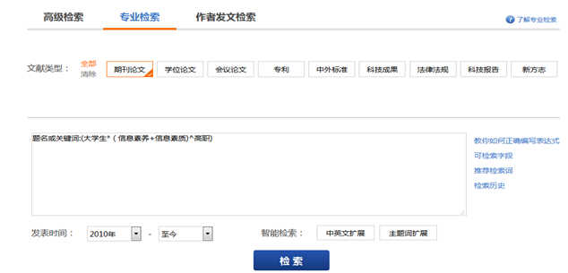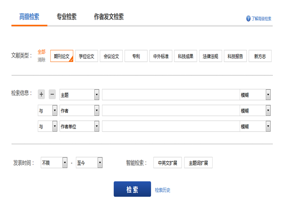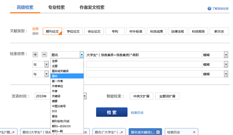 (3)专业检索 - 检索字段:全部、题名或关键词、题名、第一作者、作者单位、作者、关键词、摘要、DOI