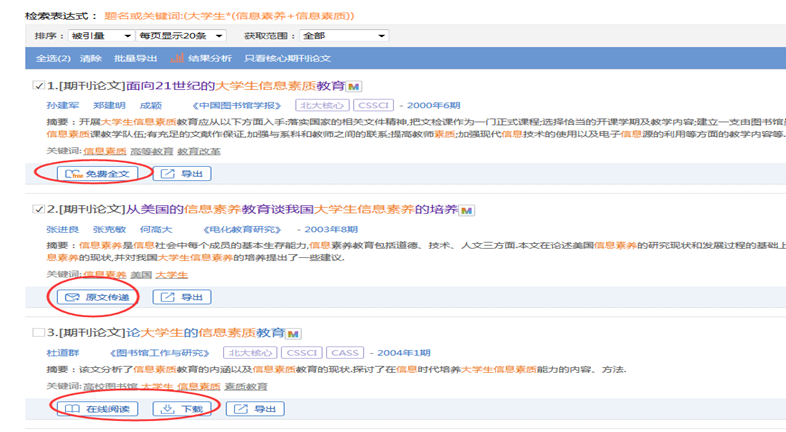 - 检索结果分组:年份、学科、期刊级别、刊名、作者、机构