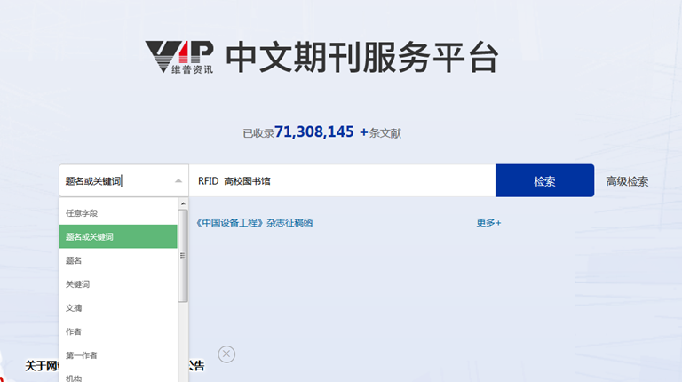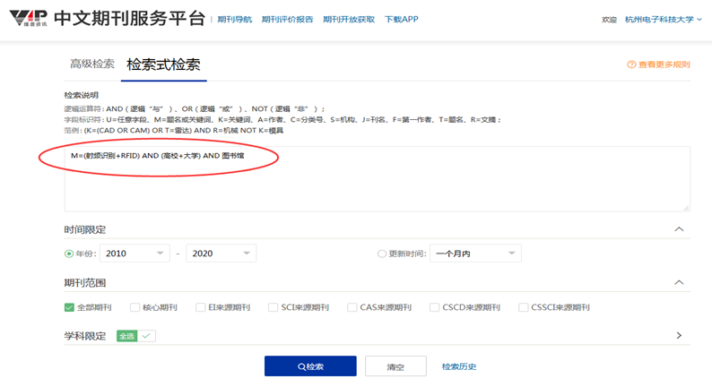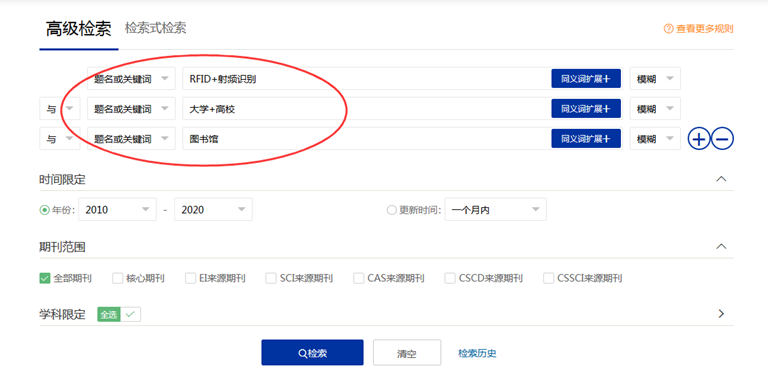 构建检索式: **(射频识别+RFID)*(高校+大学)*图书馆