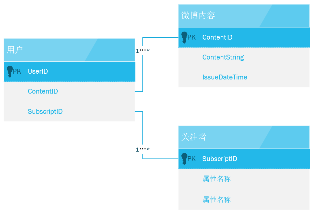 参考下以模型,每一个用户都可以发布多个博文,并且关联多个关注者: