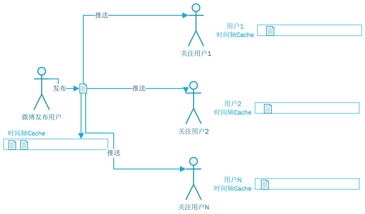 用户浏览博文和发表博文时,会以时间轴的组织方式展现在用户端,正常情况下会有多个用户在相近的时间范围内发布自己的博文,这些博文需要展现在三个地方,分别是:1)自己的空间,2)关注者的空间,3)公共空间。博文发布后,会存储在数据库中,其它用户访问系统时,都需要在数据库查询后重组时间轴关系,如果对每一个用户都执行这一个查询DB的动作,这对于数据库系统会产生很大的瓶颈,因此缓存是考虑在效率因素中,会为每一个用户增加时间轴缓存,博文发布后,会发布到以内存访问为主的Redis缓存中,也就是个人时间轴缓存,关注者的时间轴缓存及公共空间的时间轴缓存,最后异步同步到数据库MySQL群集中。