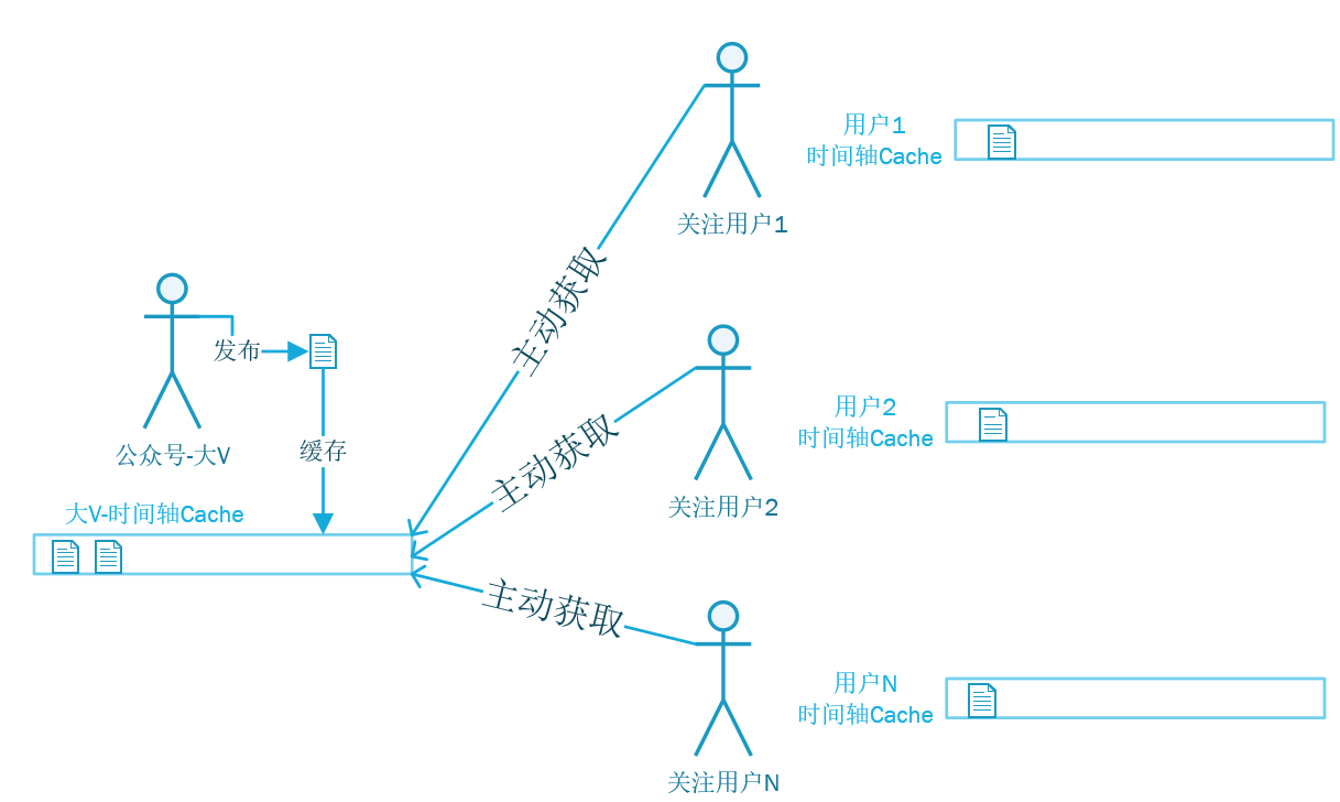 对于公众号存在大量的订阅用户,在这一场景下公众号主动更新大量订阅者的时间轴缓存,即使用Redis也需要使用几分钟,所以在这一场景下,会在前端展现之前改由订阅者主动读取公众号时间轴缓存的最新内容,如果存在多个关注的大号,则应该每一个公众号都主动刷新回最新内容,然后再把多组最新内容组装回自己时间轴缓存,最后才是进入展现环节。