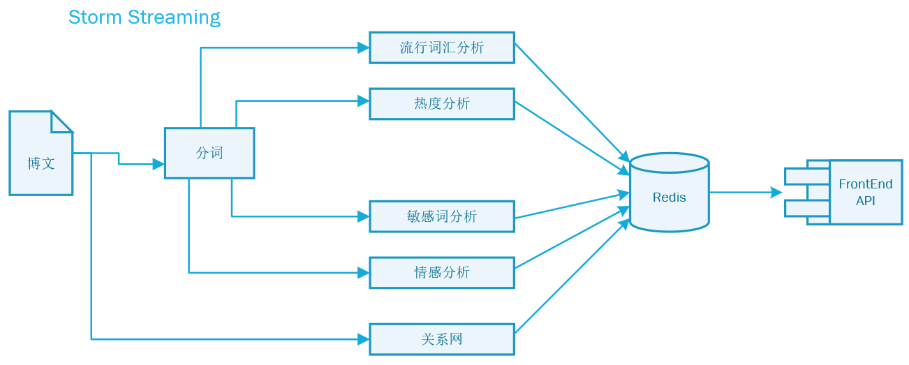 实时分析是流处理技术的一个典型案例,本方案使用Storm或者Kafka Streams,在用户发布博文时,一份副本会同时送入流处理引擎,博文的内容可以做分析流行词汇分析,热点分析,敏感词分析,关系网分析,内容分类等。