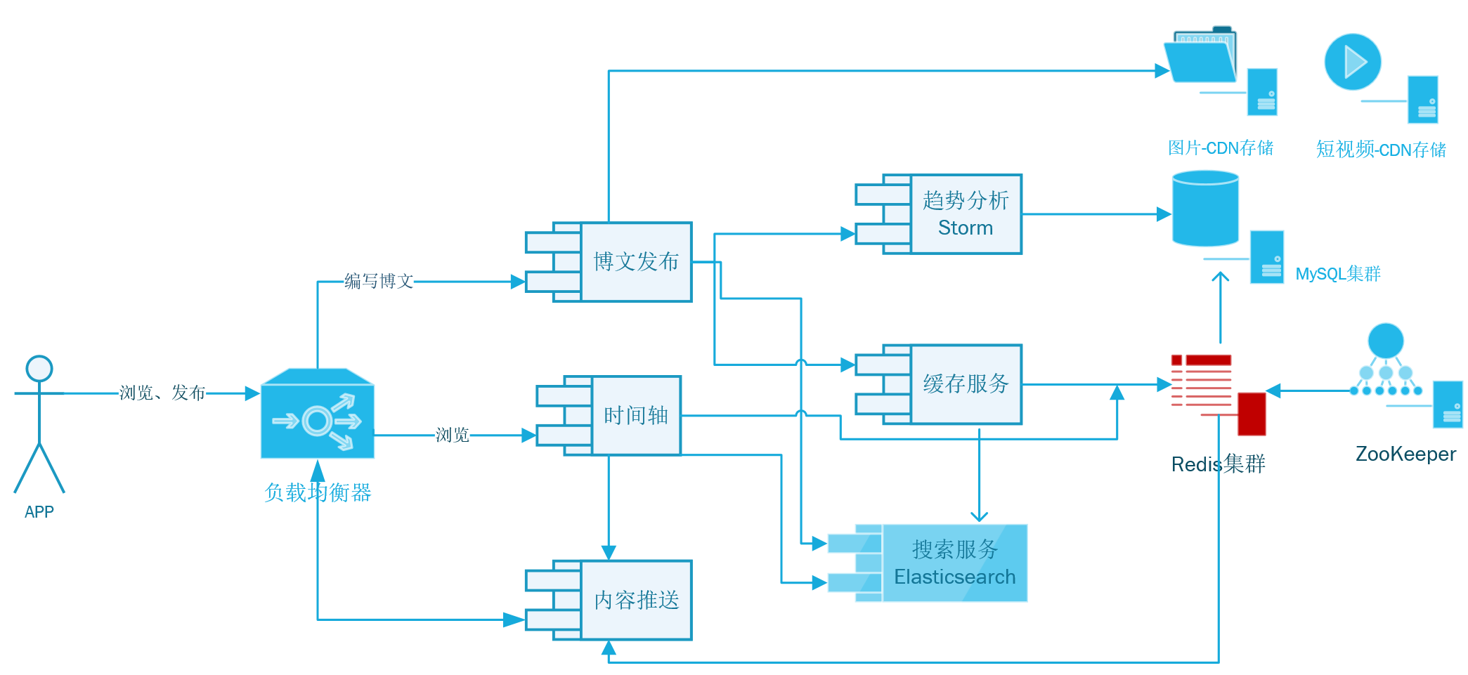 时间轴:用户发起时间轴浏览请求,从Redis中获取时间轴上的数据,渲染页面样式送回到客户端,用户发起搜索请求,从搜索服务中返回数据,渲染页面样式送回到客户端。