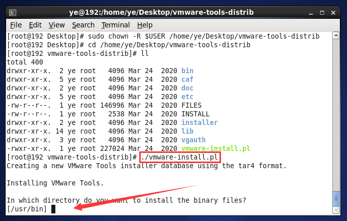 执行vmware-tools-distrib文件夹里的vmware-install.pl文件进行安装