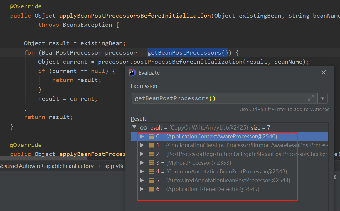 //遍历得到容器中所有的BeanPostProcessor;挨个执行beforeInitialization