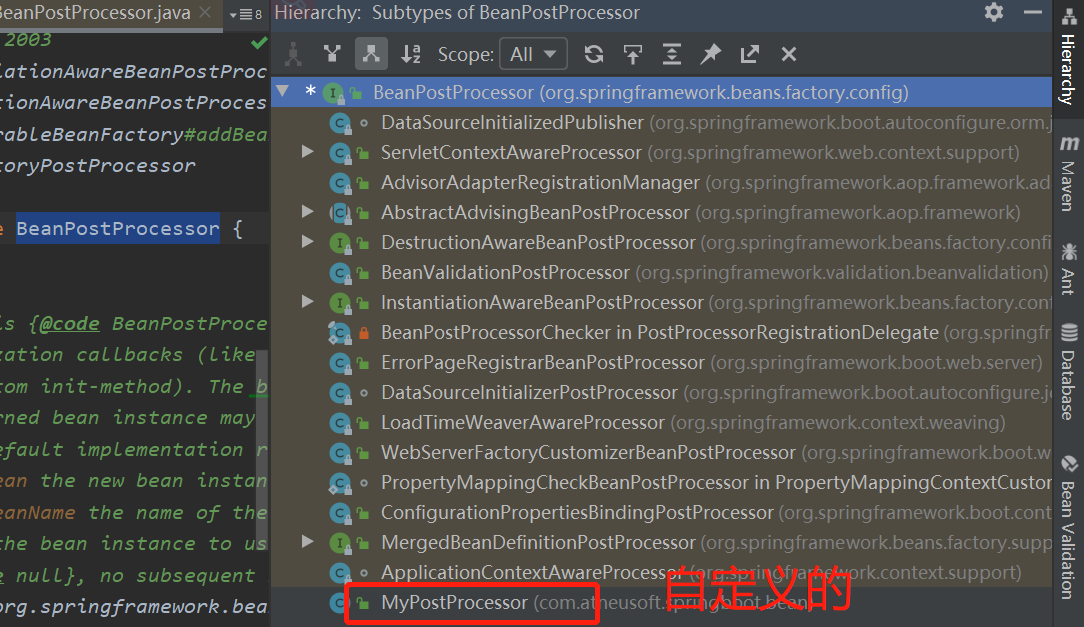 public class MyPostProcessor implements BeanPostProcessor { @Override public Object postProcessBeforeInitialization(Object bean, String beanName) throws BeansException { System.out.println("postProcessBeforeInitialization " + beanName +"===>" + bean); return bean; } @Override public Object postProcessAfterInitialization(Object bean, String beanName) throws BeansException { System.out.println("postProcessAfterInitialization " + beanName +"===>" + bean); return bean; } }