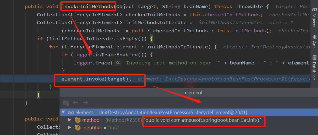 //利用反射调用bean的初始化方法 metadata.invokeInitMethods(bean, beanName); } catch (InvocationTargetException ex) { throw new BeanCreationException(beanName, "Invocation of init method failed", ex.getTargetException()); } catch (Throwable ex) { throw new BeanCreationException(beanName, "Failed to invoke init method", ex); } return bean; }