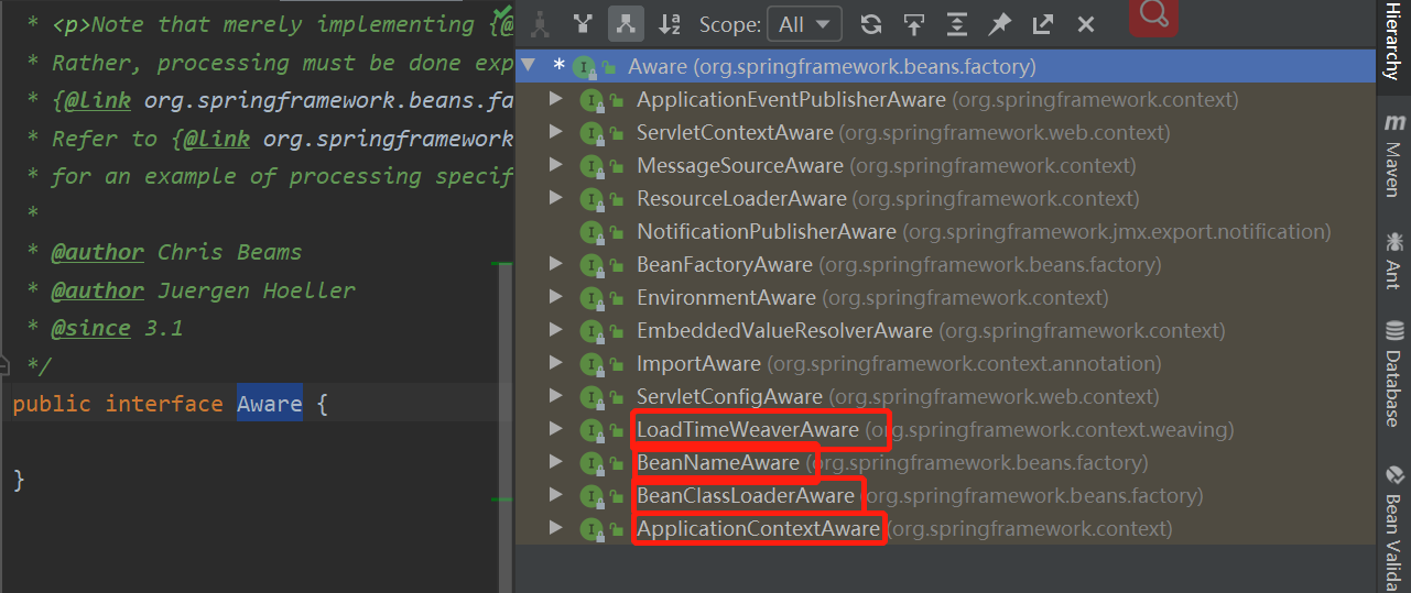 自定义组件实现xxxAware(ApplicationContext,BeanFactory,xxx)接口在创建对象的时候,会调用接口规定的方法注入相关组件,把Spring底层一些组件注入到自定义的Bean中。